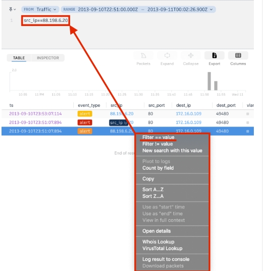Демонстрация всех срабатываний сигнатур Suricata, отфильтрованных по Source IP и Destination IP: