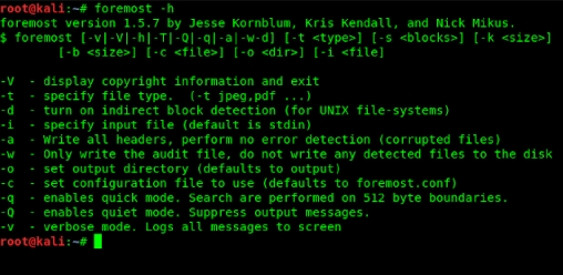 sudo foremost -t jpg,pdf,mp4 -v -q -i /dev/sdb1 -o /home/Desktop/recovered