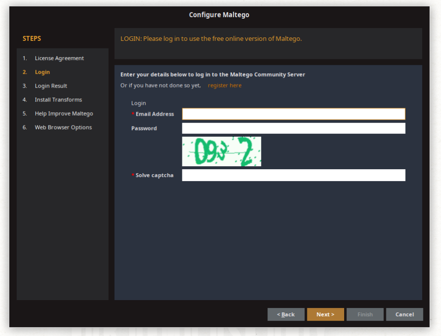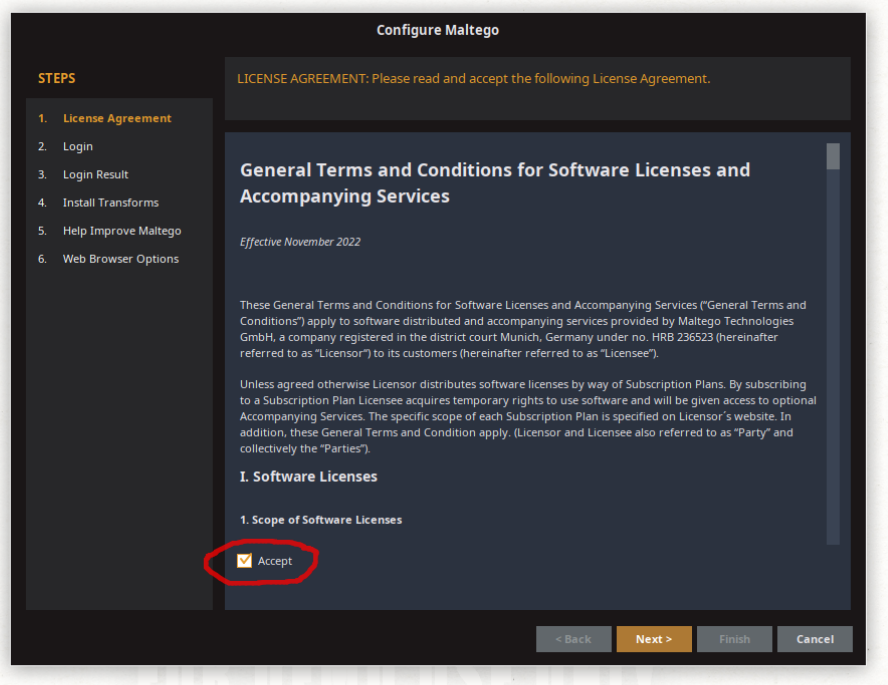 Нажмите на кнопку 'RUN', после чего появится окно конфигурации Maltego. Здесь необходимо войти в систему и выполнить первую настройку. Прежде всего, необходимо согласиться с Условиями использования, как показано на скриншоте ниже: