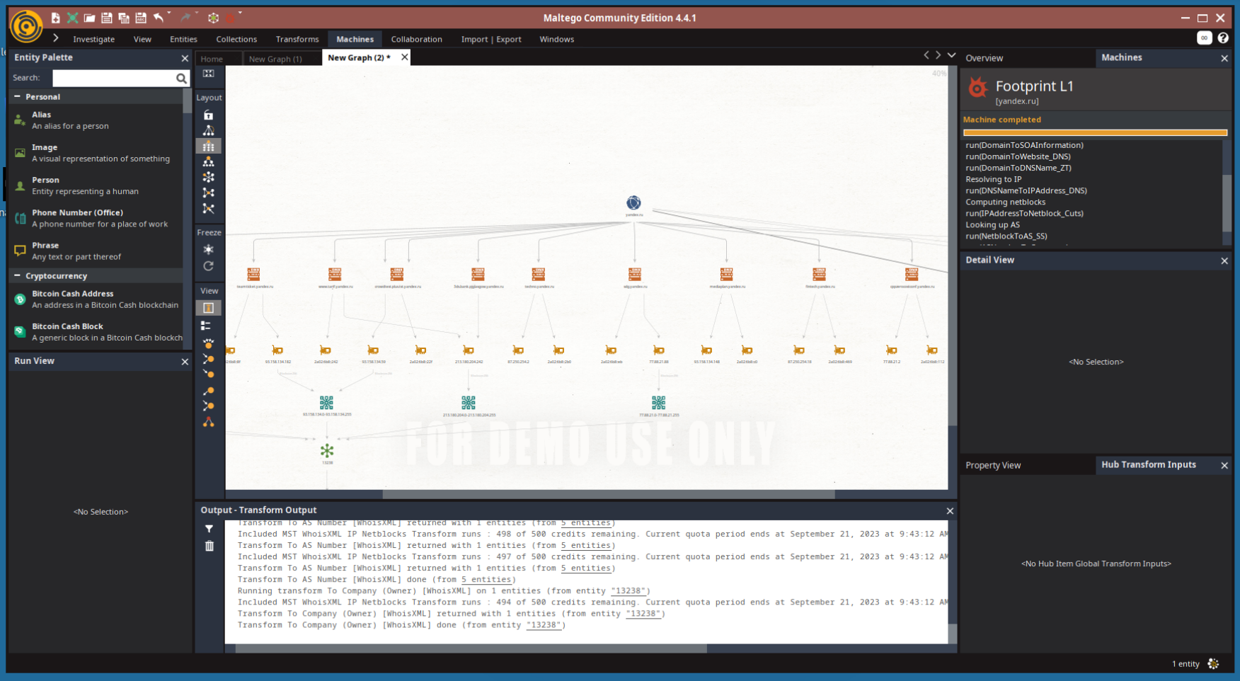 Maltego — один из самых известных OSINT-фреймворков для персональной и корпоративной разведки. Это инструмент с графическим интерфейсом, позволяющий извлекать информацию, опубликованную в Интернете различными способами, и собирать сведения о любом человеке. Maltego также может строить списки DNS и собирать данные из социальных сетей в удобном для чтения формате.