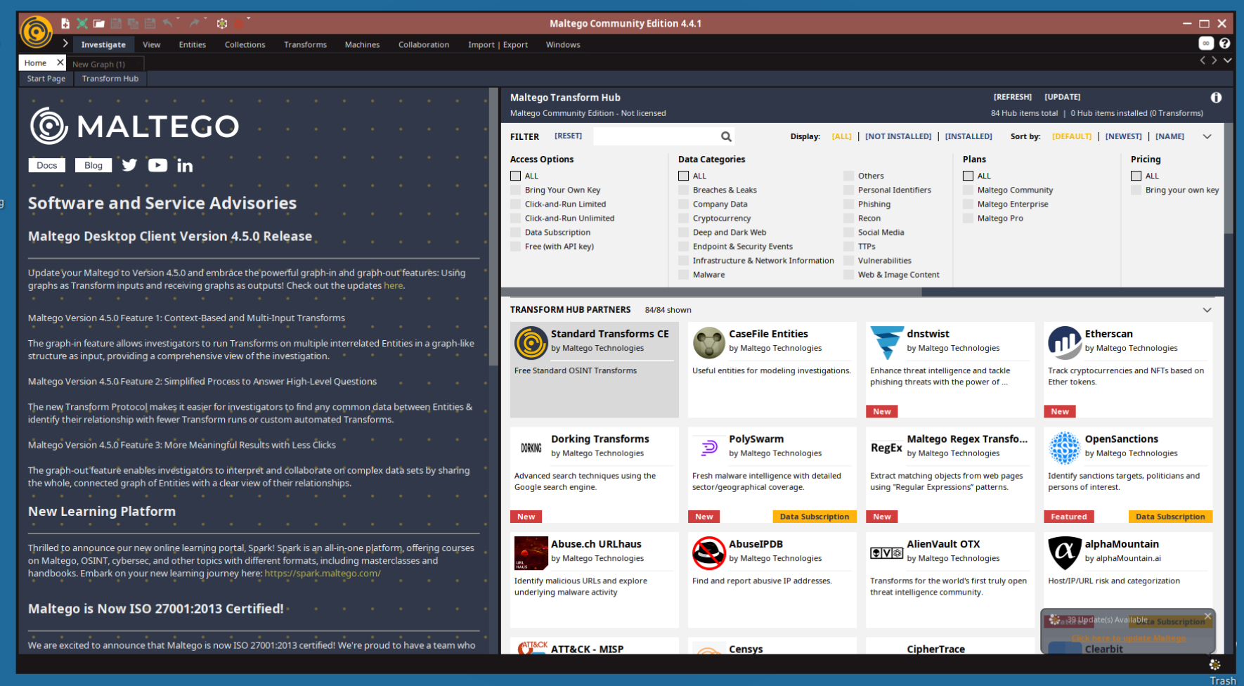 После регистрации, необходимо будет войти под зарегистрированной учетной записью. После успешного входа и скачивания необходимых обновлений Maltego, откроется основное окно: