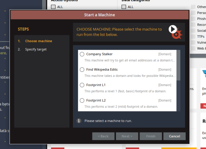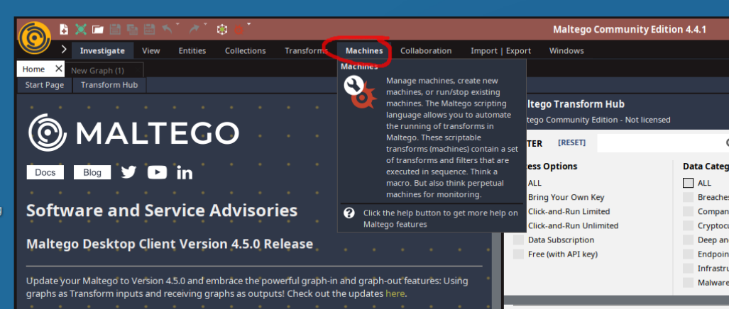 Теперь вы готовы к работе с Maltego: запустите машину, нажав на кнопку Run Machine из папки Machines в папке Menu: