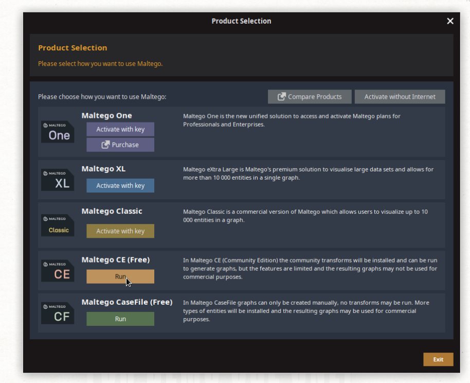 При первом открытии Maltego появляется страница выбора продукта, на которой можно приобрести различные версии Maltego, однако Community-версия Maltego бесплатная, поэтому выбераем Maltego CE → нажимаем кнопку Start.