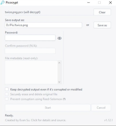 6. Расшифровать тем же способом. Запускаем Picocrypt → перетаскиваем в окно зашифрованные файлы → вводим пароль → жмём Start.