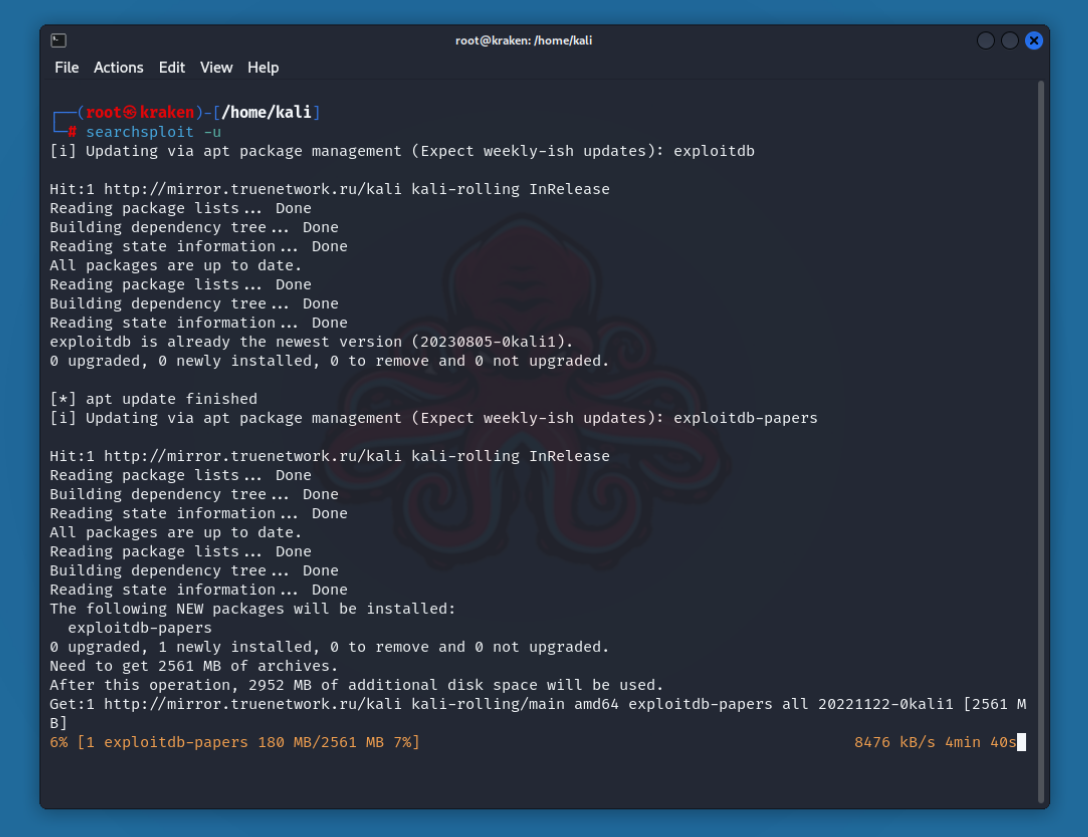 Если вы используете стандартную GNOME-сборку Kali Linux, то пакет exploitdb включен в нее по умолчанию. Однако если вы используете вариант Kali Light или собственный ISO, то установить пакет можно с этой командой:
