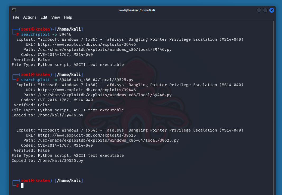 Рекомендуется не модифицировать эксплойты в локальной копии базы данных. Вместо этого сделайте копию интересующего вас эксплойта и используйте его из своего рабочего каталога. Опция m позволяет выбрать любое количество эксплойтов для копирования в ту же папку, в которой вы находитесь в данный момент: