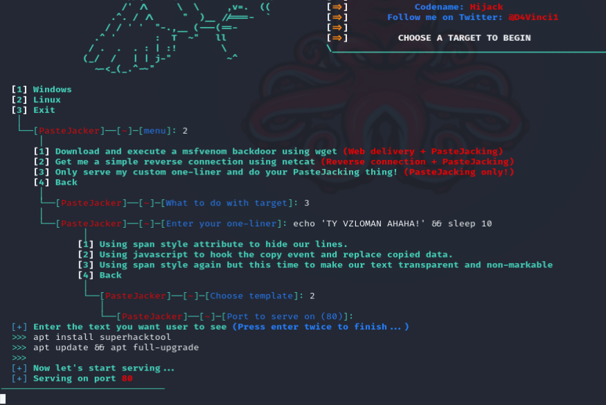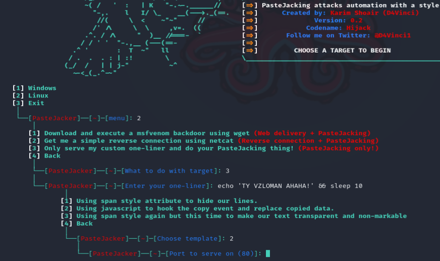 Инструмент PasteJacker предложит ввести порт, но по умолчанию используется порт 80, поэтому оставьте его пустым и нажмите Enter.